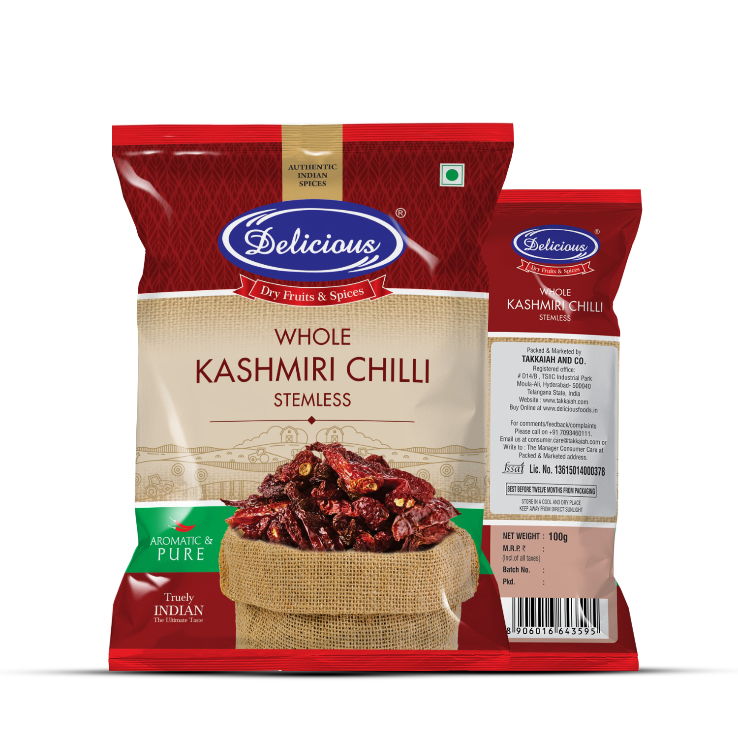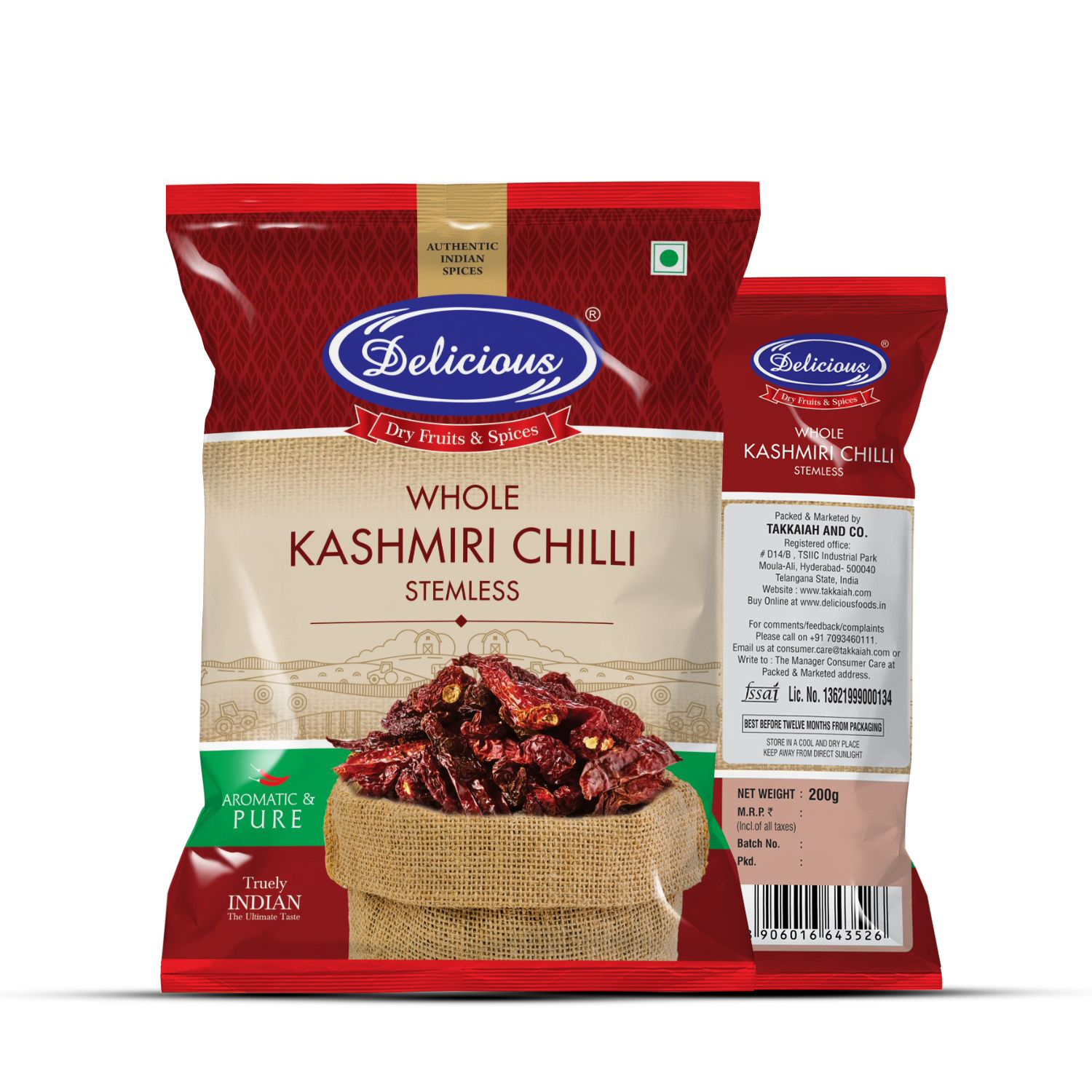 Discover the perfect addition to your favorite dishes with our Delicious Kashmiri Chilli Stemless Whole! Grown and harvested in India, this fiery Mirchi adds a bright, smoky flavor and a vibrant red color to your meals. 100% natural and stemless for easy use and superior taste.